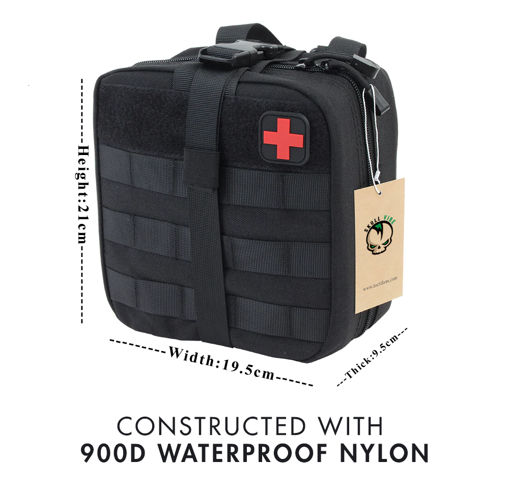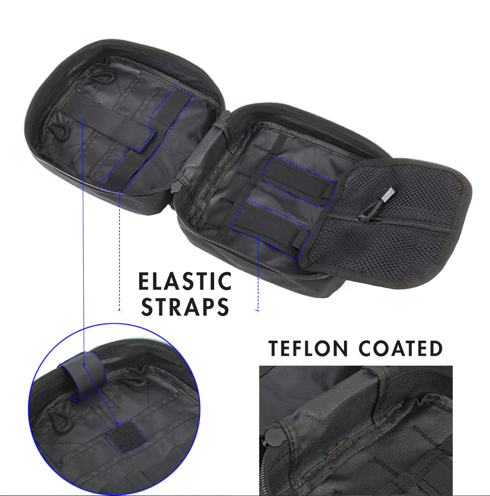 This is the perfect bag for first aid.  Built with tough, premium materials, our tactical medical pouch is worn, tear, and weather resistant. With a trifold design featuring spacious compartments, numerous pockets, and strong elastic loops, this tactical pouch keeps bandages, gauze pads, tapes, medicine, shears, and supplies organized and within easy reach!