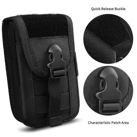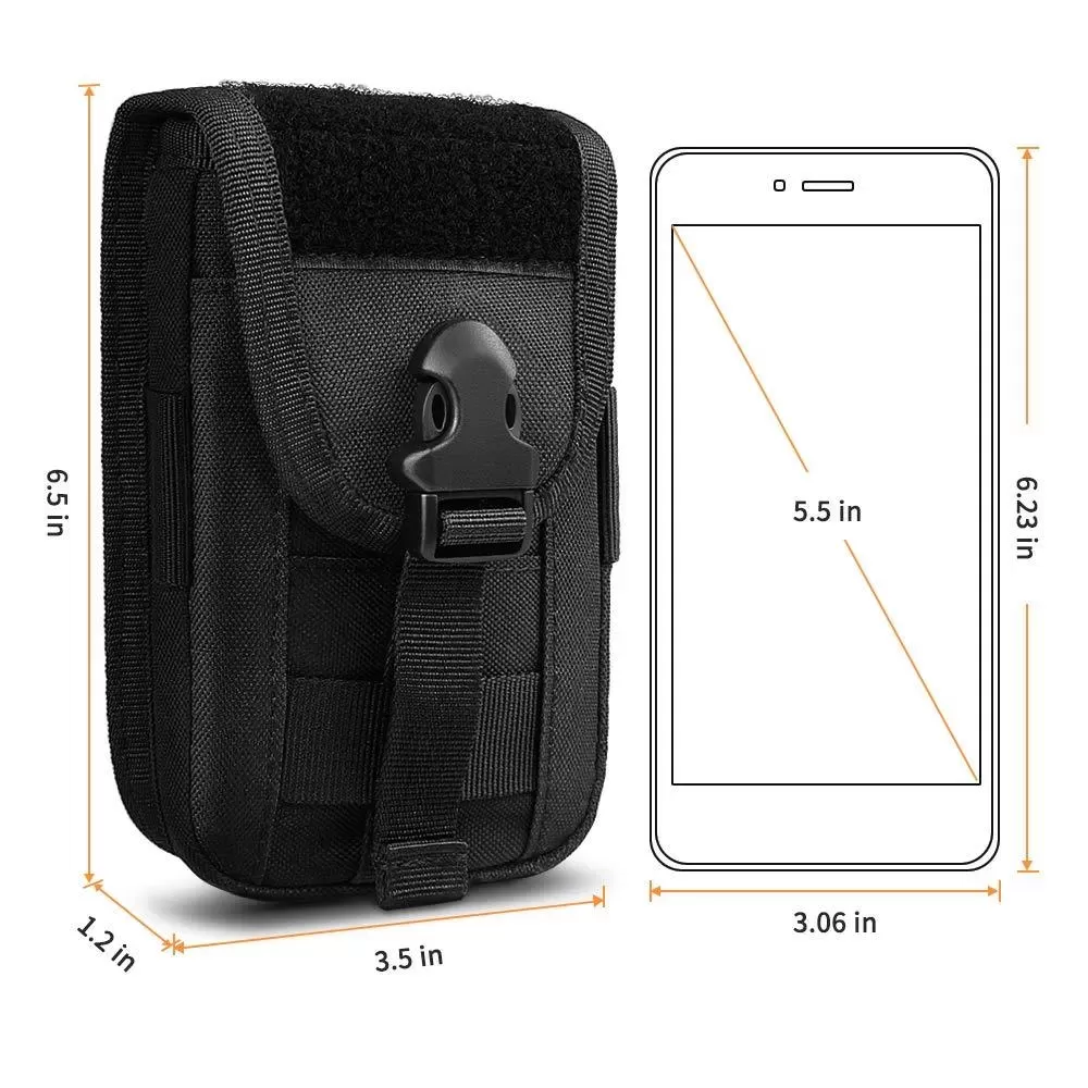 • MOLLE SYSTEM: EDC phone pouch has strong webbing belt loops on the rear, deadly hard wearing & heavy duty. The buckle strap on the back could be attached to a tactical backpack, combat vest, belt, or other tactical gears as an extra exterior pouch or carry it as a normal pouch to secure essential gears.