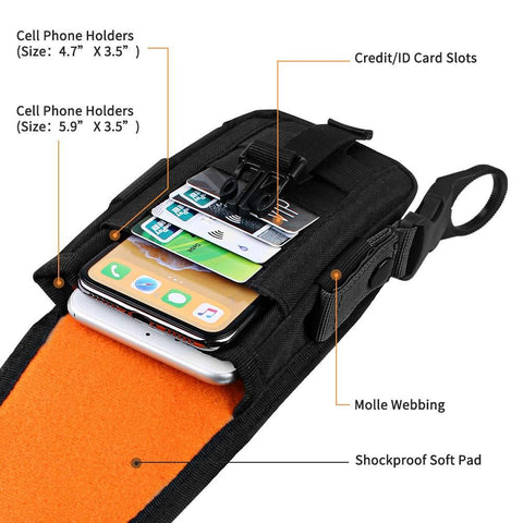 • EFFICIENT POCKETS: The phone holster has 1 main compartment, available to hold 2 cellphones(max to 6 inches). 4 Card slots & 1 Cash Holder provide you to put debit card, credit card, ID card, receipts, or some cash while on the go.